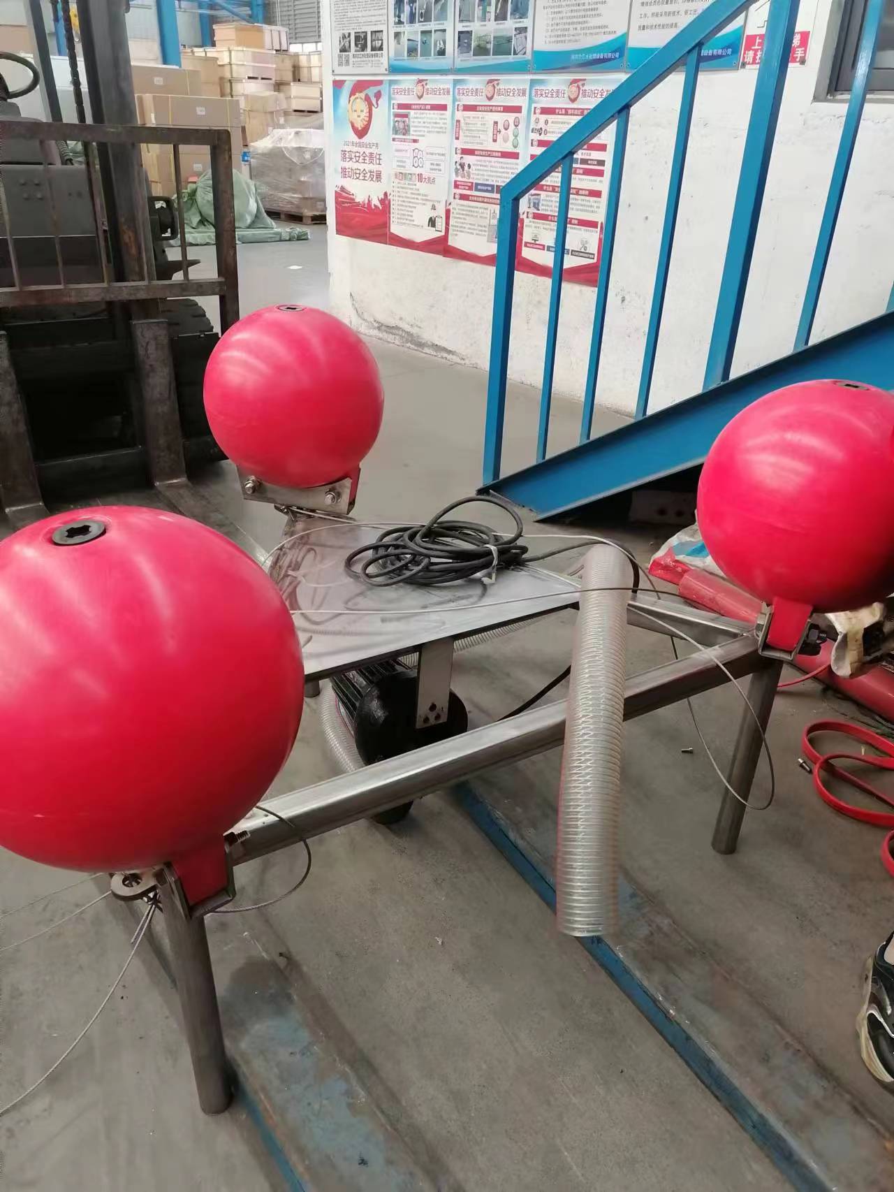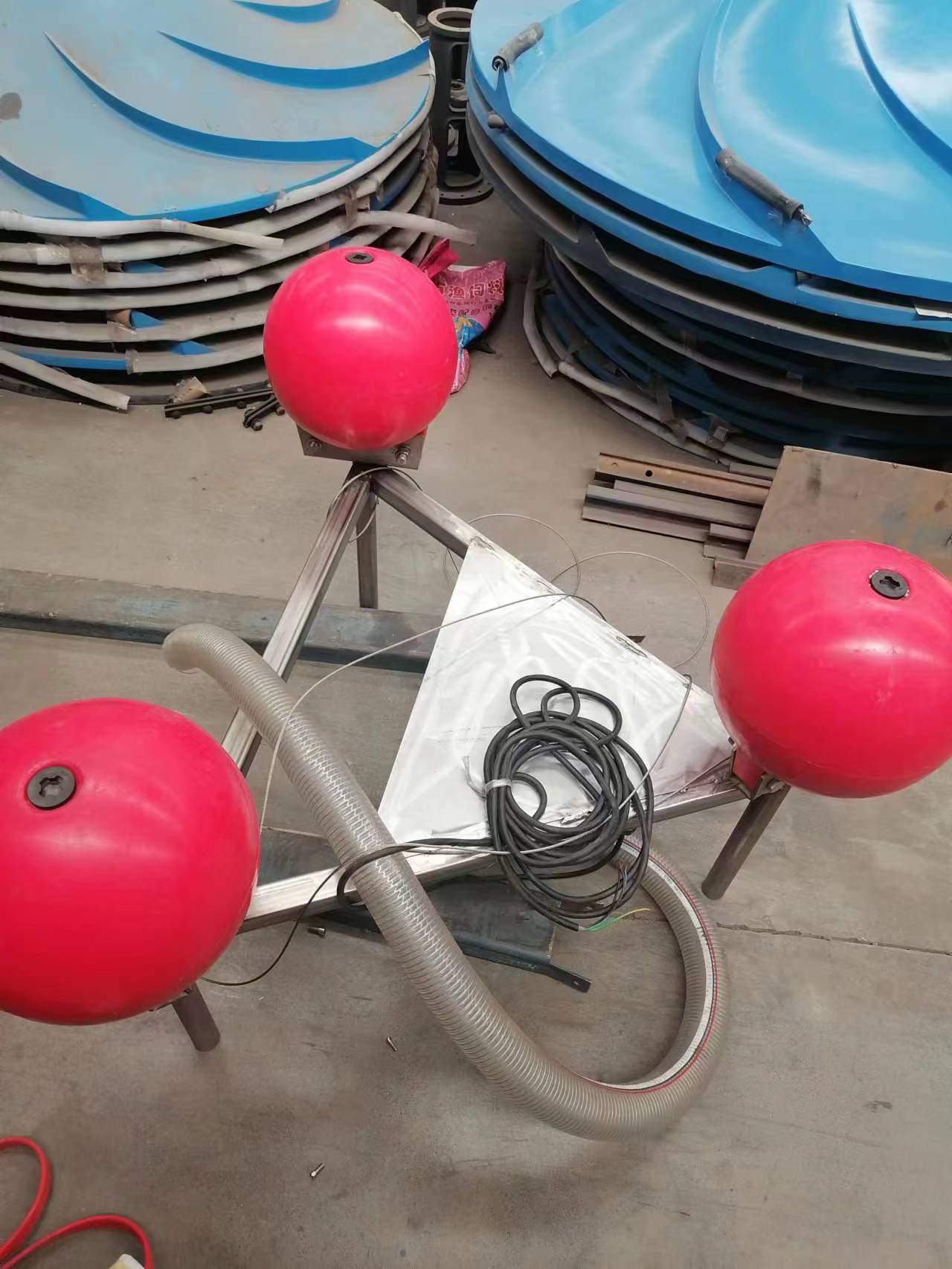 該機主要由浮筒、導流筒、 潛水電機和螺旋槳等部件組🤶🏾成,導⛹🏻‍♀️流筒借助浮筒的浮力呈豎直方向懸浮在水面下,吸口朝上,貼近水面,出水口向下。當電機驅動葉輪高速旋轉時,導流筒吸口上方附近的浮泥連同水被吸入導流筒,在葉輪的作用下經破 碎後從導流筒出口泵出,被送入水下。