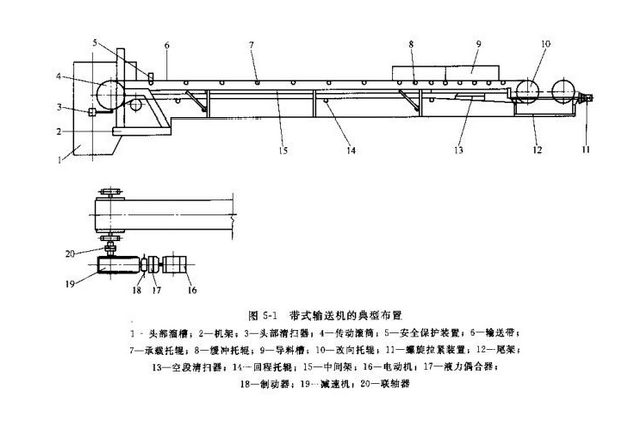 固定式皮帶輸送機整體結構如圖所示,主要部件如下:輸💌送帶、驅動裝置(電機、減速機、液力偶合器、制動器、聯軸器、逆止器)或電動滾筒、傳動滾筒、改向滾☠️筒、托輥、拉緊裝置、清掃器、卸料器、機架、漏鬥、導料槽、安全保護裝置等。