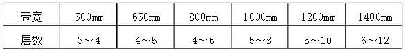 輸送帶是輸送機中的牽引和承載構件,所以應耐磨,具有😝較高強度,在橫的或縱的方向都有良好的撓曲性,皮帶一般分😮💨橡膠運輸帶、塑料運輸帶、鋼帶、金屬網🥑️帶等,橡膠運輸帶又有👩🏼❤️👨🏾普通型和特殊型之😥分,焦化廠一般采用普通型橡膠運輸帶,橡膠運輸😍帶由數層棉織布用硫化橡膠黏結而👀成,帶的上、下面及左右兩側都覆以橡膠保護層,棉織布的♌️層數與膠帶的寬度有關,層數加多,能承載的總壓力也越多,但層數增加時🤶🏾,帶的橫向撓曲性減🧑🏻❤️🧑🏼小,常見橡膠帶棉織👩🏼❤️👨🏾布的層數如下表: