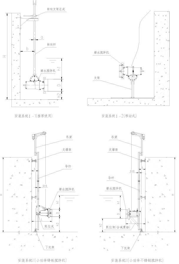 安裝系統可在無需排出池中污水情況下,能快速安裝和拆卸👩🏽🐰👩🏿潛水攪拌機;安裝系統Ⅰ隻适用池深<4m,機⛹🏻♀️型爲QJB0.85/8-260/3-740C和QJB1.5/6-260/3-980C攪拌機,其中💑🏾Ⅰ-1可在😜水平方向和垂直方向進行調節;安裝系統Ⅱ、Ⅲ、Ⅳ、Ⅵ适用于池深≥4m,導杆可沿水平方向繞導杆軸🧛🏽線旋轉,大轉角-60°~+60°當池深大于4米時,應在導杆中間增加一支撐架;