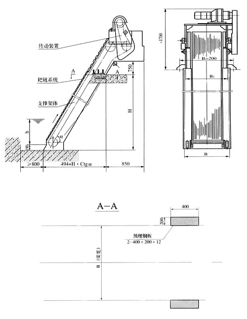 5、當B>1500時,應考慮兩組鏈條由一個傳動裝置拖動。機械格栅清污機