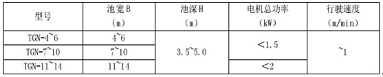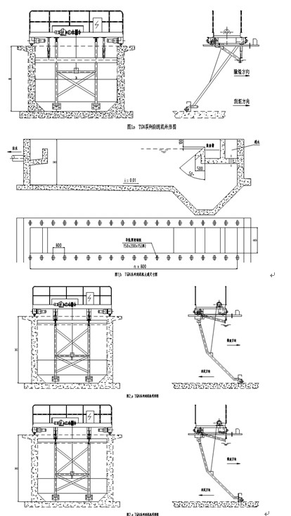 TGN 系列刮泥機如圖1a、2a所示,由行車、刮泥耙、撇渣耙、驅動👼🏾裝置和控制櫃等組成。
